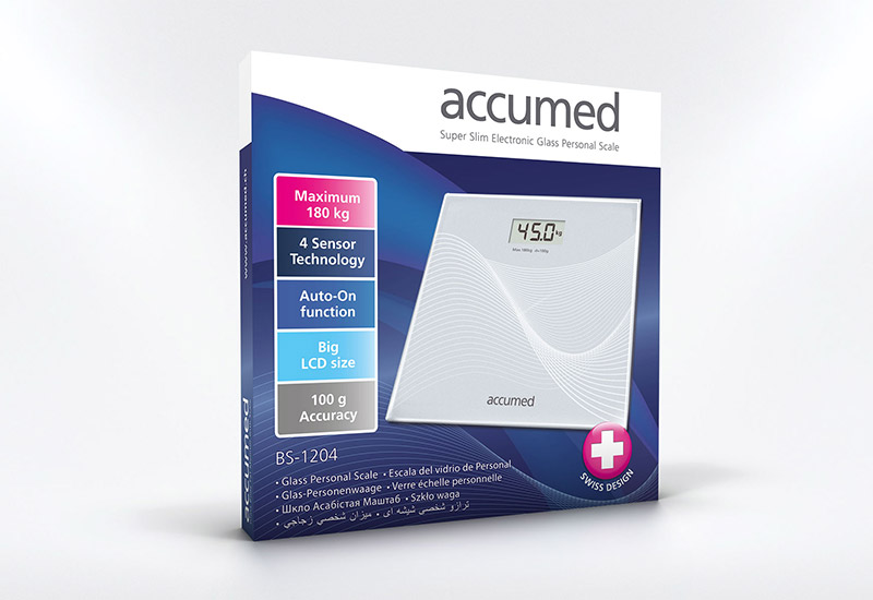 ترازوی «اکیومد» (Accumed) مدل «ترازو دیجیتال اکیومد مدل WB۱۰۴» دارای سطح شیشهای است و دقت اندازهگیری 100 گرم دارد. حداکثر وزنی که این ترازو قادر به اندازهگیری آن بوده، 180 کیلوگرم است و اگر وزنی بیشتر از این مقدار روی آن قرار بگیرد، عبارت O-Ld روی صفحه ظاهر میشود. برای روشنکردن ترازو کافی است با پا چند ضربه روی آن بزنید تا سنسورهای اندازهگیری وزن، ترازو را روشن کنند. دقت اندازهگیری وزن 100 گرم است و این یعنی تغییرات وزن کمتر از 100 گرم را تشخیص نمیدهد. البته حتی یک لیوان آب هم وزنی بیشتر از این مقدار دارد. برای اینکه سنسورهای زیر ترازو بتوانند وزن را بهدرستی اندازهگیری کنند، ترازو باید روی سطحی کاملا صاف و بدون ناهمواری مانند سنگ و سرامیک قرار بگیرد. نمایشگر ترازو از نوع LCD است و عدد وزن را بزرگ و خوانا نشان میدهد. انرژی ترازو از 3 عدد باتری نیمقلمی تأمین میشود که نسبت به باتریهای سکهای که عموما در ترازوها استفاده میشوند، در دسترسترند. هنگامیکه باتریها ضعیف شوند، عبارت Lo روی نمایشگر ترازو نشان داده میشود. برای کارکرد دقیق ترازو هنگام ضعیفشدن باتریها، باید آنها را تعویض کرد. به کمک دکمهای که کنار محفظهی باتری قرار دارد، میتوان واحد نمایش وزن را بین یکی از سه حالت کیلوگرم، استون و پوند تغییر داد. روی سطح ترازو از شیشهی آبدیده استفاده شده که زیر آن، خطوط منحنی زیبایی نقش بسته است. پس از اندازهگیری وزن، ترازو پس از 10 دقیقه به شکل خودکار خاموش میشود. به طور خلاصه ترازوی Accumed BS-1204 دارای دقت 100 گرم، حداکثر وزن قابلاندازهگیری 180 کیلوگرم، سطح شیشهای طرحدار و قابلیت تغییر واحد نمایش وزن بین کیلوگرم، پوند و استون است و به کمک 3 عدد باتری نیمقلم کار میکند.